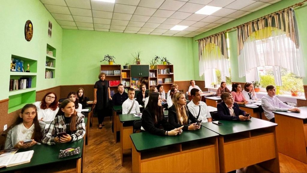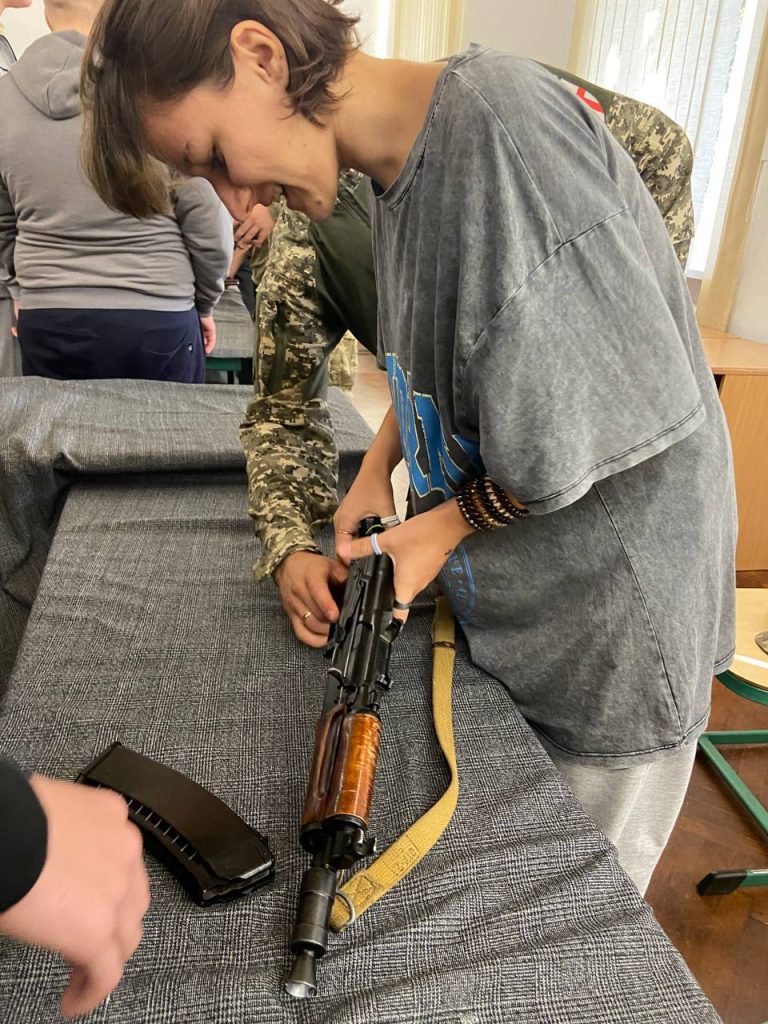 Військовослужбовці ЗСУ на занятті «Захист України» ознайомили студентів та учнів з видами бронежилетів, шоломів, стрілецької зброї, будовою протитанкового гранатомету.