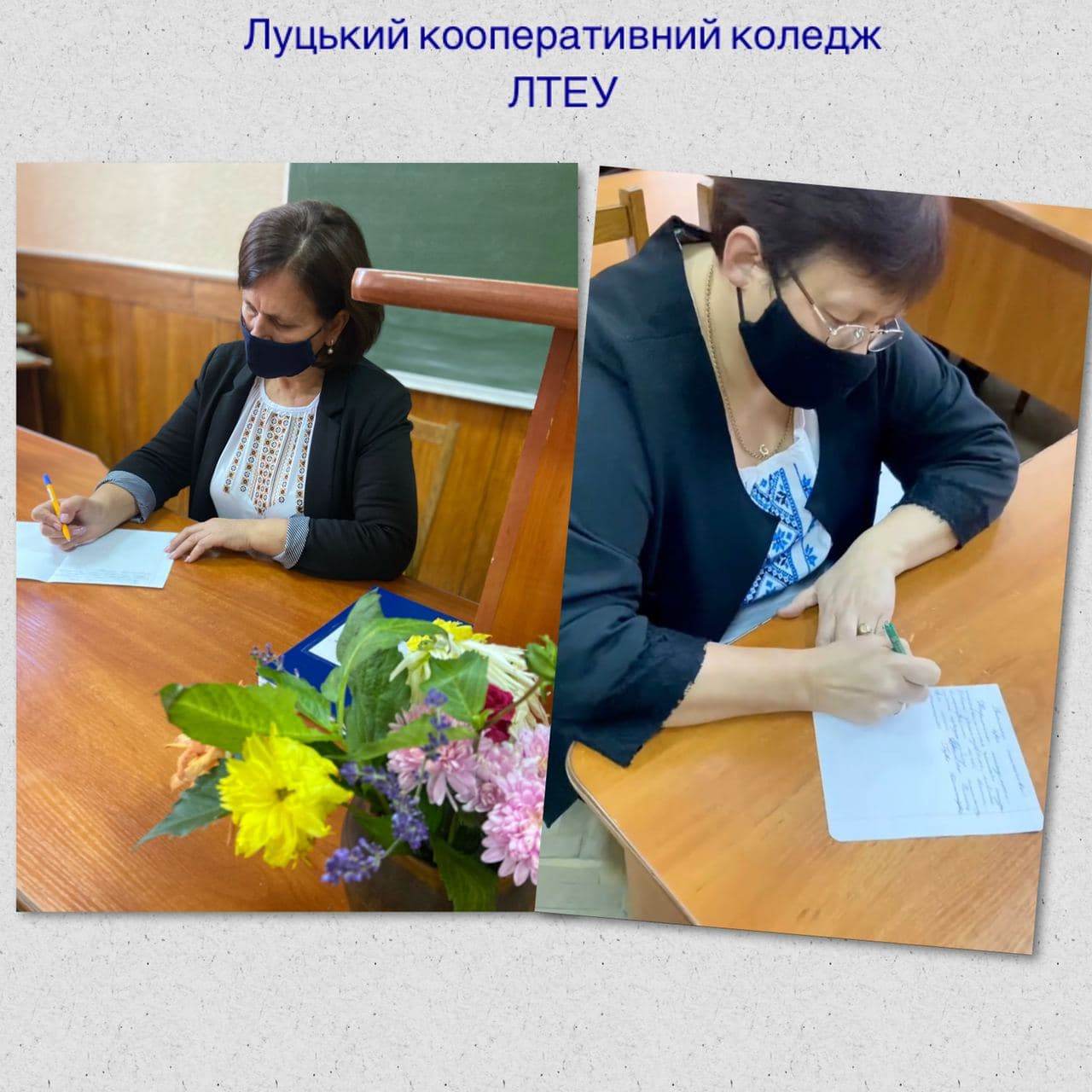 Студенти і викладачі Луцького кооперативного коледжу ЛТЕУ, 9 листопада, у День української писемності та мови, долучилися до написання ювілейного ХХ Всеукраїнського радіодиктанту національної єдності. Участь у цьому багаторічному флешмобі – не просто перевірка на грамотність. Це можливість відчути себе частиною великої нації, поєднатися з усіма українцями світу навколо рідної мови. За багаторічну історію, вперше радіодиктант писався в напівпорожніх аудиторіях, однак більшість студентів та викладачів долучилися онлайн.