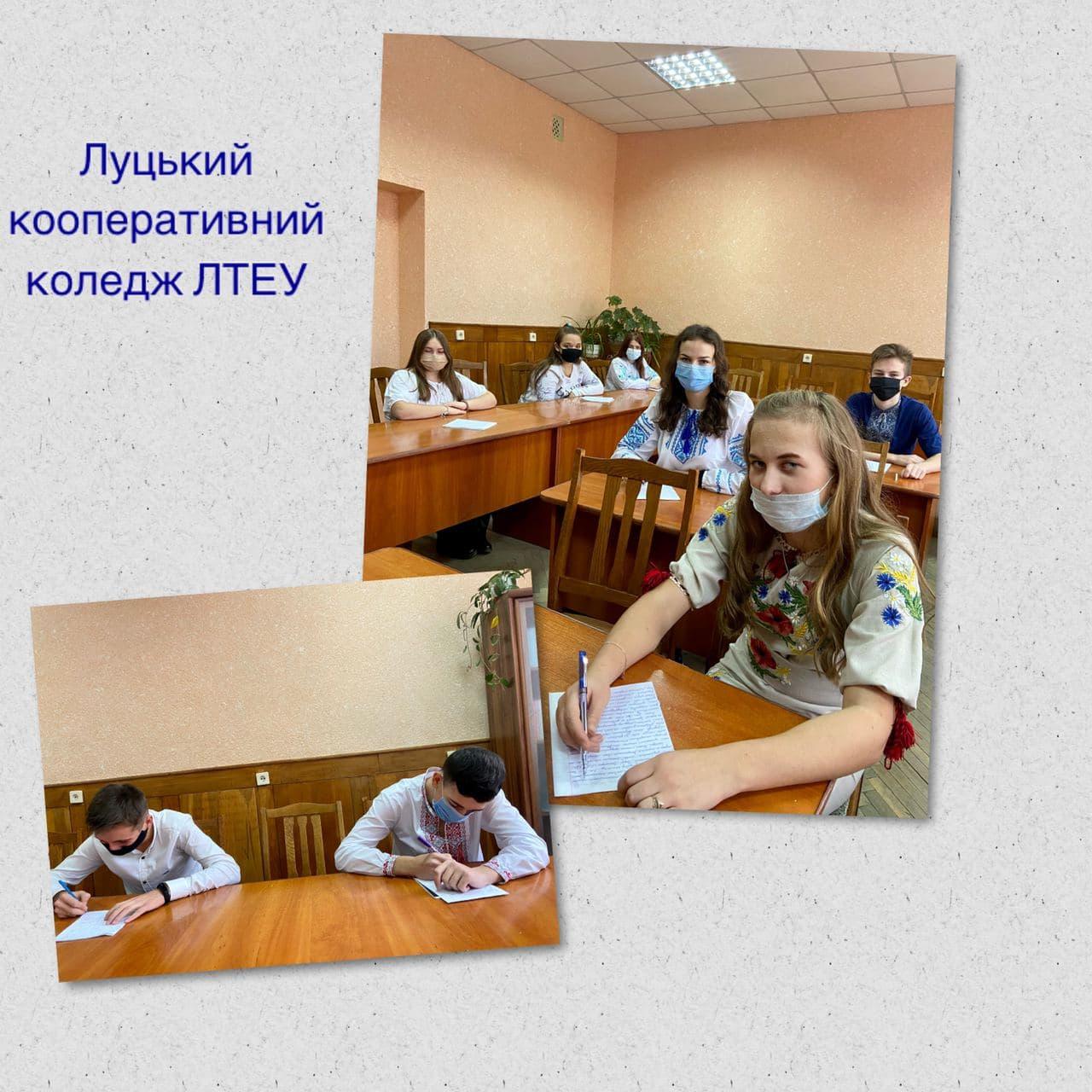 Студенти і викладачі Луцького кооперативного коледжу ЛТЕУ, 9 листопада, у День української писемності та мови, долучилися до написання ювілейного ХХ Всеукраїнського радіодиктанту національної єдності. Участь у цьому багаторічному флешмобі – не просто перевірка на грамотність. Це можливість відчути себе частиною великої нації, поєднатися з усіма українцями світу навколо рідної мови. За багаторічну історію, вперше радіодиктант писався в напівпорожніх аудиторіях, однак більшість студентів та викладачів долучилися онлайн.