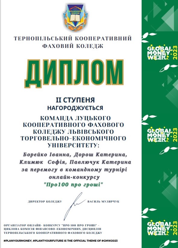 Студенти Луцького кооперативного фахового коледжу ЛТЕУ спеціальності «Фінанси, банківська справа та страхування» взяли участь в онлайн-конкурсі «Про100 про ГРОШІ», який проходив на базі Тернопільського кооперативного фахового коледжу. Наша команда зайняла почесне ІІ місце.