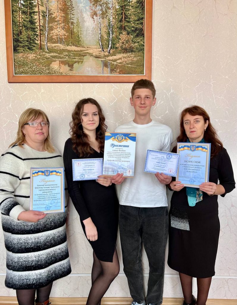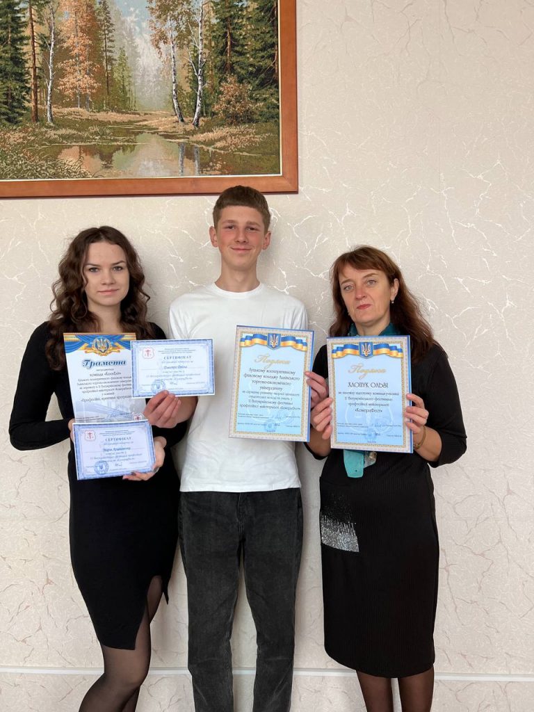 Учасники команди «КоопЕліт» Арцішевська Марійка та Дейна Дмитро виконали чотири завдання з товарознавства продовольчих та непродовольчих товарів, маркетингу, організації й технології торговельних процесів та здобули перемогу в номінації «Професійні, креативні, прогресивні», отримали сертифікати.