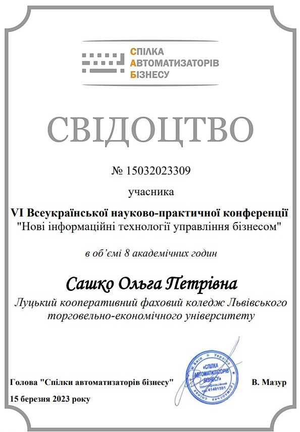 Освіта протягом життя в усьому світі, особливо в розвинених країнах, стає все більш важливою сферою освітніх послуг. Щоб встигати за світом – треба постійно навчатися. Отож, не лише студенти Луцького кооперативного фахового коледжу ЛТЕУ здобувають нові знання, але й викладачі намагаються підвищувати свій професійний рівень. Олена ЦВЕК та Ольга САШКО, викладачі обліково-економічних дисциплін, в черговий раз взяли участь у Всеукраїнській науково-практичній конференції «Нові інформаційні технології управління бізнесом», яку проводить Спілка Автоматизаторів Бізнесу. Учасники ознайомилися з новими інформаційними технологіями, обмінялися практичним досвідом їх викладання та застосування в підготовці фахівців, шляхами співпраці з членами Спілки для реалізації спільних освітніх та дослідницьких проєктів.