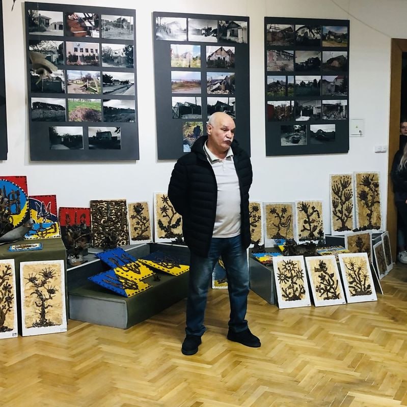 Здобувачі освіти мали можливість ознайомитись з експозицією квітів, які викладені із уламків бомб і ракет, осколків снарядів та мін, які вбивають українців, а також серію світлин із руїнами міста. Автор представив не лише свої картини, але й презентував усім власну книгу мемуарів «Спогади про окупацію, обстріли та художню творчість».